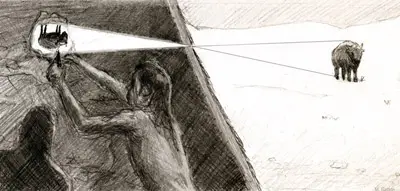 Ali vivíam em cavernas, protegidos da agressividade animal. Um dia notaram que um fino buraco em uma das paredes deixava entrar um faixo de luz, que quando projetado em outra parede, produzia uma imagem do exterior invertida verticalmente, vivenciando, pela primeira vez, a transformação da Imagem Real em Imagem Virtual e os elementos físicos que mais tarde nos dariam a invenção da Câmara Escura e da Câmera Fotográfica e Cinematográfica.